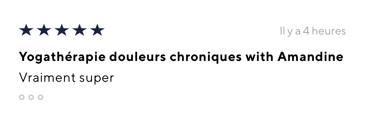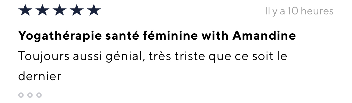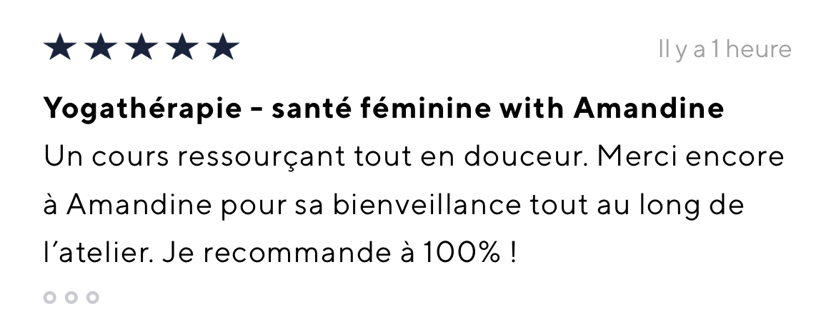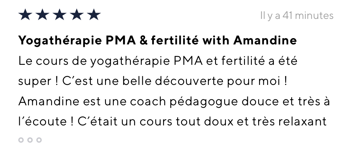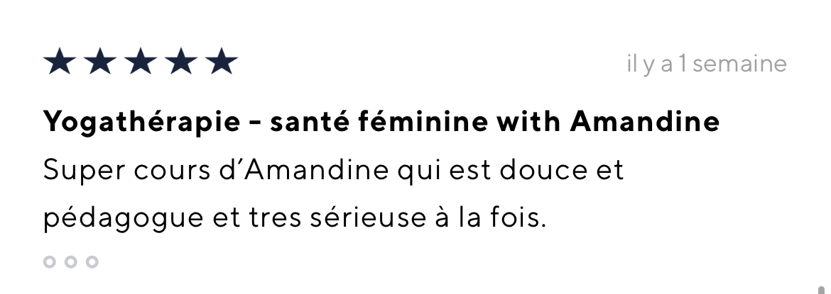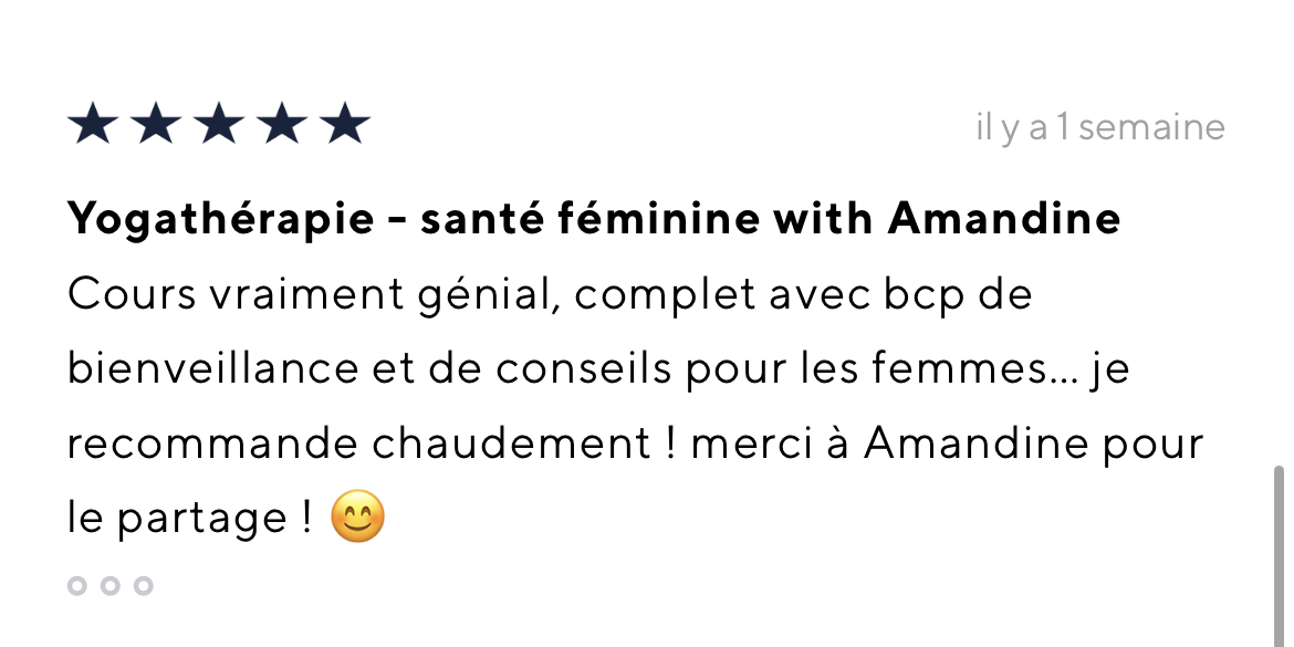 Je recommande vivement le programme yogathérapie de Bertille et Amandine. La qualité des informations fournies sur l'endométriose, la douleur, et comment les soulager par la respiration et le mouvement est exceptionnelle. L'approche en yogathérapie est tout à fait pertinente et adaptée à l'endométriose et à ses conséquences sur le corps, loin des banalités qu'on peut retrouver ailleurs et qui sont finalement peu efficaces et peu personnalisées. En proposant aussi bien des postures d'étirements et de mobilité que de renforcement musculaire, l'approche est complète et efficace. Il y a des pratiques toutes douces et une pratique plus tonique, donc le programme s'adapte à notre état du moment. La fausse inspiration thoracique est aussi hyper efficace sur l'endobelly. Je trouve enfin les explications aussi essentielles que les pratiques, car ce sont les explications qui permettent de faire un bond en avant dans la compréhension et la gestion de son endométriose. Merci pour le programme qui m'a réconciliée avec le yoga !